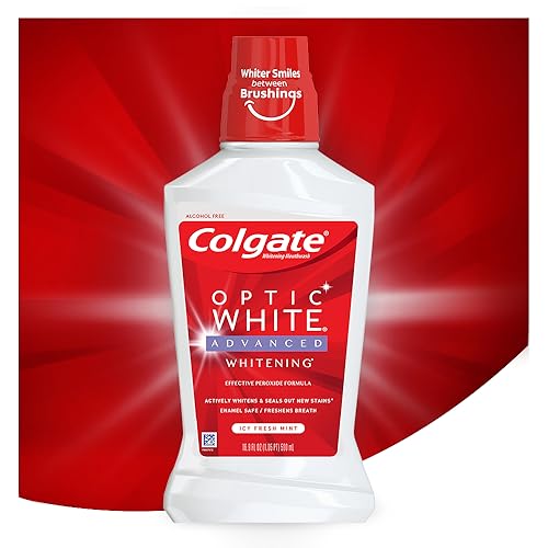 Colgate Optic White Mouthwash is an alcohol-free, enamel-safe whitening mouthwash that not only freshens breath, but actively whitens teeth, and seals out new stains. Its effective hydrogen peroxide formula helps remove surface stains and helps to prevent new stains between brushings.